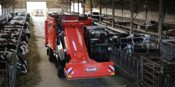 Egy 120 tejelő tehenet tartó gazdaságban, ahol naponta 3 keveréket készítenek, évente több mint 10500 fel- és leszállást takarítanak meg a traktorról a teleszkópos rakodógépre! Az önjáró keverőkocsi minden rakodási, keverési és elosztási funkciót a fedélzeten lát el, így Ön a munka teljes időtartama alatt a fülkében ülve maradhat.