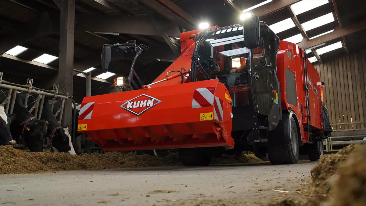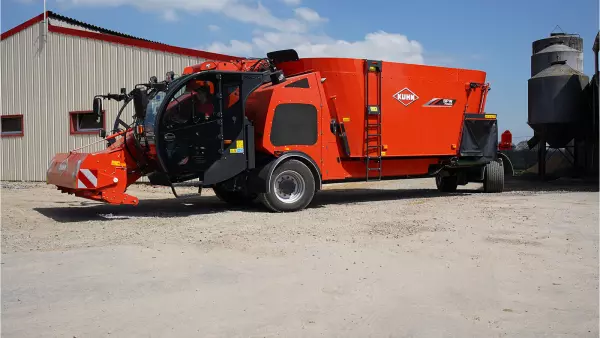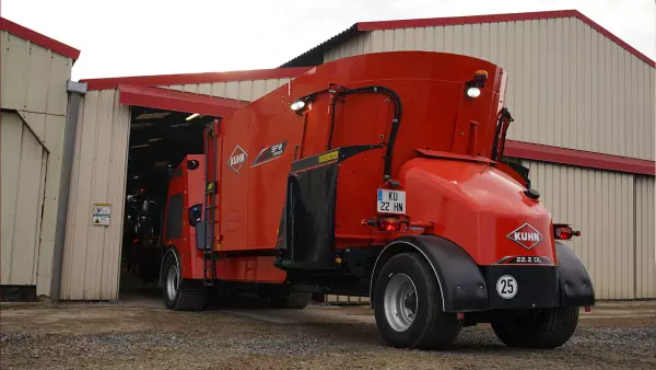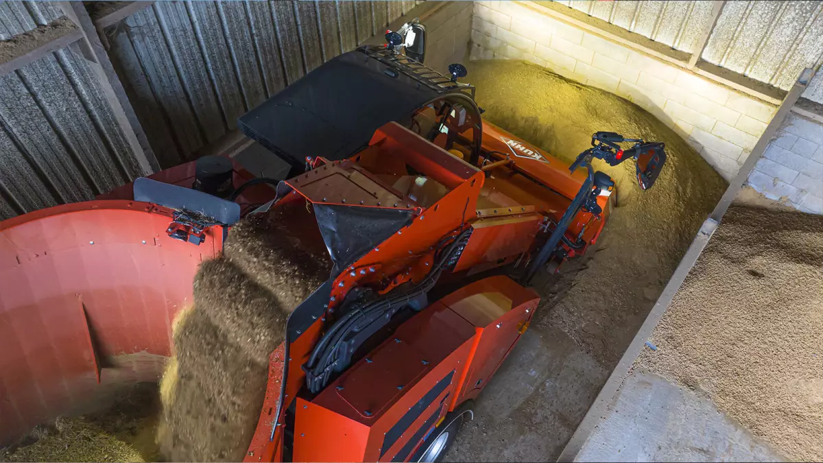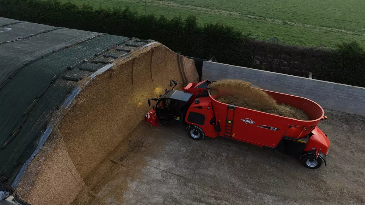 A silótartály lábának megközelítési mérése szintén kizárólag a KUHN önjáró keverőgépekre jellemző. A silótartály lábához közeledve a szállítópálya süllyedési sebessége csökken, hogy simán érkezzen le a talajra. Kíméli a silótartály padlózatát, csakúgy, mint a gép aprítószerkezetét és szállítószalagját.